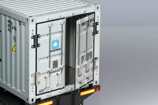 - The container features the same gray livery as that of the shipping company MAERSK.