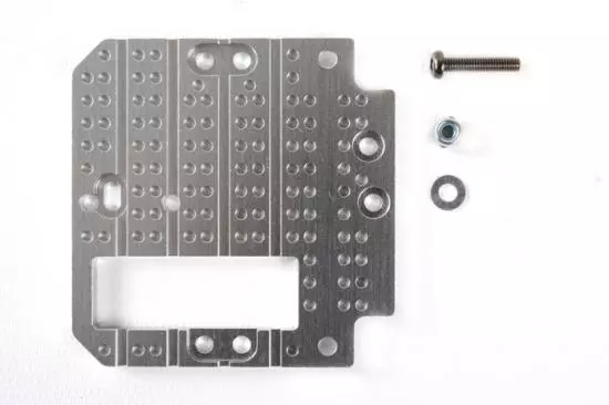 Aluminum parts give a more authentic weighty feel when compared to kit-standard plastic parts. This coupler lever plate is a part used in the coupler unit of R/C tractor truck models, which enables the use of separately available support legs. The aluminum part gives Tamiya’s RC semi-trucks a more realistic look.