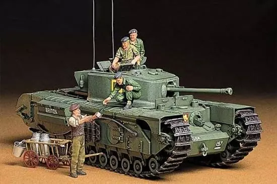 Despite the serious teething problems in its mechanics, the British Infantry Tank MK.IV or the “Churchill” went on to earn a high reputation among the WW2 British armored fighting vehicles. Following the tradition of the rhombic-shaped predecessors during WW1, its design priority was placed on heavy armor, a wide trench crossing capacity and the ability to travel across the shell-torn battlefields. Speed was not considered to be essential, since its main role would be to escort and support the infantry. Christened the “Churchill” after the Prime Minister of England, it began to arrive at the Tank Regiments in June 1941. The Churchill tank stable is classified into several types according to the main armament used, or the hull and turret construction. The MK.VII was radically different from the earlier models, with the hull and turret completely new in structure. The entire hull was welded, rather than being riveted. The maximum armor thickness was increased from 102mm to 152mm. Consequently, the weight augmented to 40 tons, resulting in a reduction in top speed from 18 to 13 mph. The turret was redesigned for higher strength and improved productivity. The four walls were a single casting of varying thickness, onto which the roof plate was welded. The powerful 75mm gun was adopted as the main armament. The active service of the Churchill tanks, especially from D-Day onwards, is worthy of the name of the principal British tank.