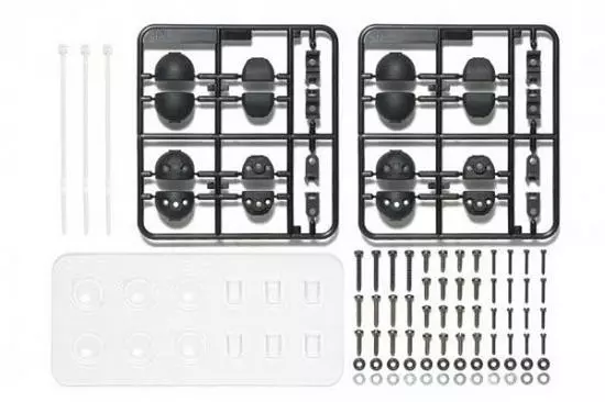 This set includes four each of round and square light pods with plastic pods and polycarbonate lens. Separately sold Item 53909 Tamiya LED Light Unit (TLU-01) gives your model super realism with lights turned on. This is compatible with Comical buggies series, the Hornet, and Buggy Champ. Screws, washers and nuts are included.