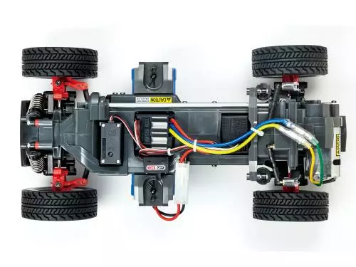 Based around a tough monocoque frame with integrated gearboxes, this compact 4WD chassis gives a thrilling drive whether you take it on road or flat dirt surfaces. It features a rear-mounted motor, with gear-driven rear wheels and a propeller shaft taking power to the front. Both front and rear gearboxes have differential gears. The battery pack location in the chassis center secures excellent balance, while 4-wheel independent double wishbone suspension employs friction dampers. Off-road capable M-05Ra chassis uprights and hub carriers are also included.