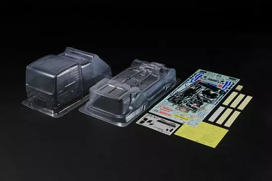 This is a complete spare body parts set of the Team Hahn Racing MAN TGS Semi Truck. The set includes the team livery sticker set, window masking tape, and plastic side mirrors.