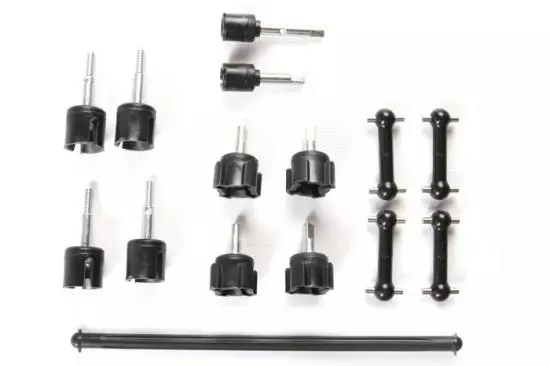 This spare parts bag includes dog bones and axles for the TT-01 chassis. It includes 2 long and 2 short axles. The short axles are used for the front of the TT-01, which will give the TT-01 a track width of 185mm. The long axles are used for the rear of the TT-01, which will give the TT-01 a track width of 190mm. Note: You will need the long axles only if you are using a body set which has a wider rear tract/width. Example: The Ferrari Enzo and the Porsche 911 have a wider rear track, therefore long rear axles are used to widen the rear of the TT-01 to ensure a true to scale appearance. When using Tamiya body sets that are 185mm wide for both the front and rear only use the front axles as replacements or purchase item 9005713, which includes 4 short axles.