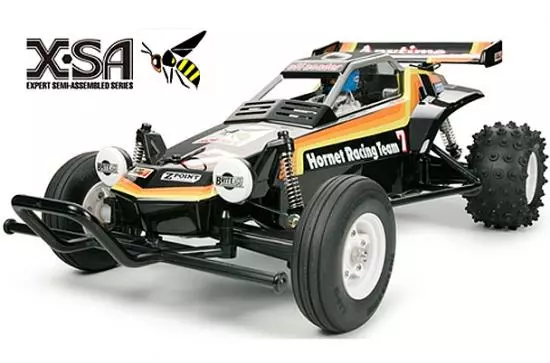 The revolutionary 1984 2WD off-road buggy is back and more fun than ever before! The Hornet stands as one of Tamiyas most popular R/C cars ever released, helping launch a 2WD R/C buggy boom worldwide. Featuring excellent performance on both dirt and on-road tracks, this awesome buggy can take on any type of terrain. Just like the original, this re-release features an easy to assemble chassis and drivetrain. The Hornet is perfect for those that used to have one, those that have always wanted one, and for those that want a revolutionary buggy that has earned its place in R/C history.